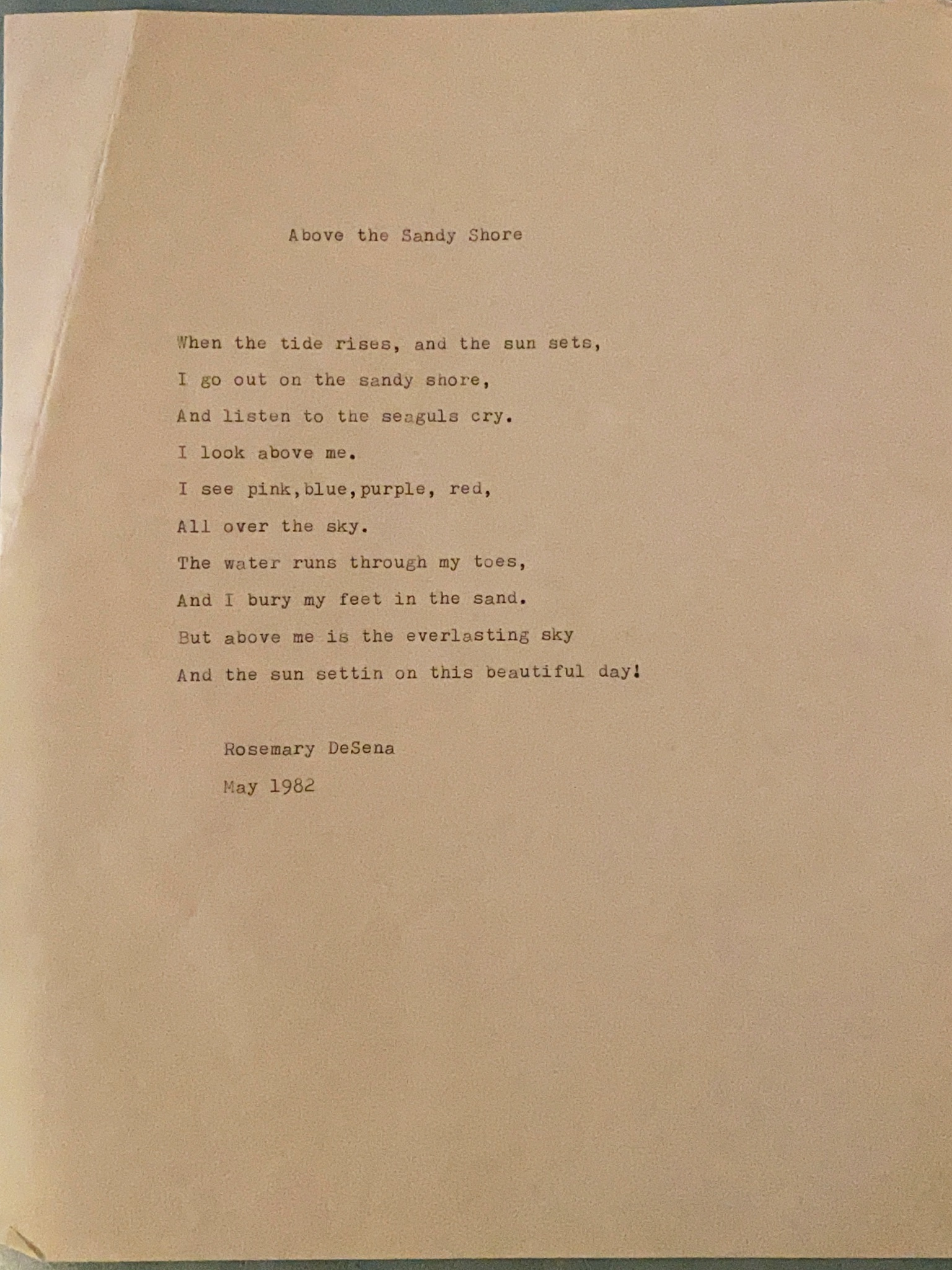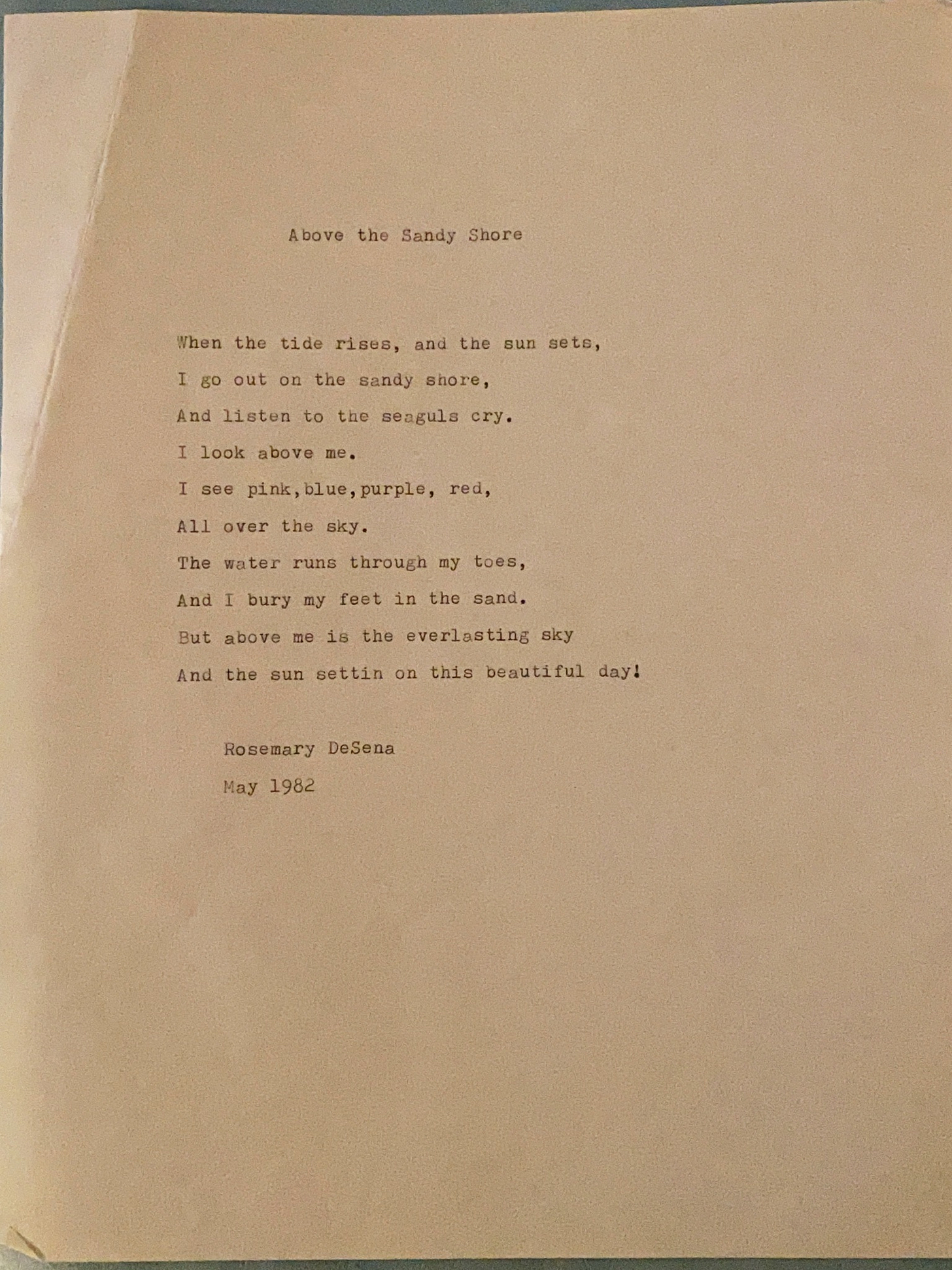 - Rosemary DeSena, May 1982I continued writing through my teen and college years, and then into my twenties and thirties, taking a class here or there after college, but didn’t share much with anyone. Instead I filled up journals that I kept in my closet.